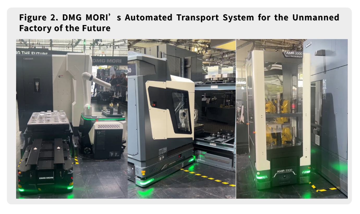 For the "Factory of the Future," DMG MORI showcased various Autonomous Guided Vehicles (AGVs) and mobile robots capable of transporting materials, chip bins, large components, and tools. Driven by a Smart Manufacturing Execution System (MES), these systems coordinate production scheduling, tool management, and vehicle dispatching. Robots mounted on AGVs can move between machines, using CCD vision for origin positioning and workpiece alignment, enabling truly flexible "high-mix" production.