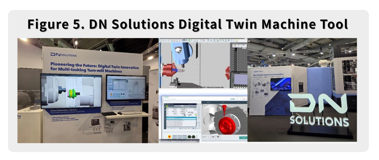 DN SOLUTIONS introduced a Collision Protection System (CPS) based on Digital Twin technology. Utilizing GibbsCAM or Siemens software, the system predicts and stops potential collisions before they occur, preventing downtime. They also demonstrated a "Process Digital Twin" for multitasking machines, allowing operators to verify programs in a virtual environment via Siemens RMVM, significantly reducing setup risks.