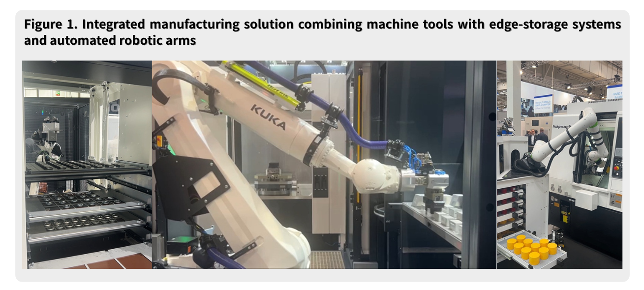 In recent years, European manufacturers have also faced growing labor shortages. As a response, flexible automation has emerged as a crucial strategy for machine tool builders. At the show, DMG MORI demonstrated automation solutions tailored to various industries—including aerospace, semiconductors, automotive, biomedical, energy, and precision components. By integrating machine tools with edge-storage systems and robotic arms, the company showcased modular production cells capable of flexible loading/unloading and automated jig/fixture changeovers.