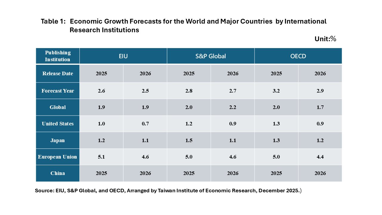 According to forecasts from multiple international research institutions (see Table 1), global and major economies are expected to maintain steady growth in 2026. Signs of easing tensions emerged from the fifth round of trade negotiations between the United States and China in Malaysia, while supply chain relocation continues to drive economic expansion in ASEAN countries. These factors are likely to boost global manufacturing investment confidence and, consequently, increase demand for machine tools. However, uncertainties such as the Russia-Ukraine war, Middle East conflicts, geopolitical tensions between India and Pakistan, Thailand and Cambodia, deteriorating China-Japan relations, and potential renewed trade sanctions between China and the United States may still affect global economic performance in 2026. The following sections analyze major economic and trade policies in key countries closely linked to Taiwan’s machine tool industry, either as important markets or major competitors.