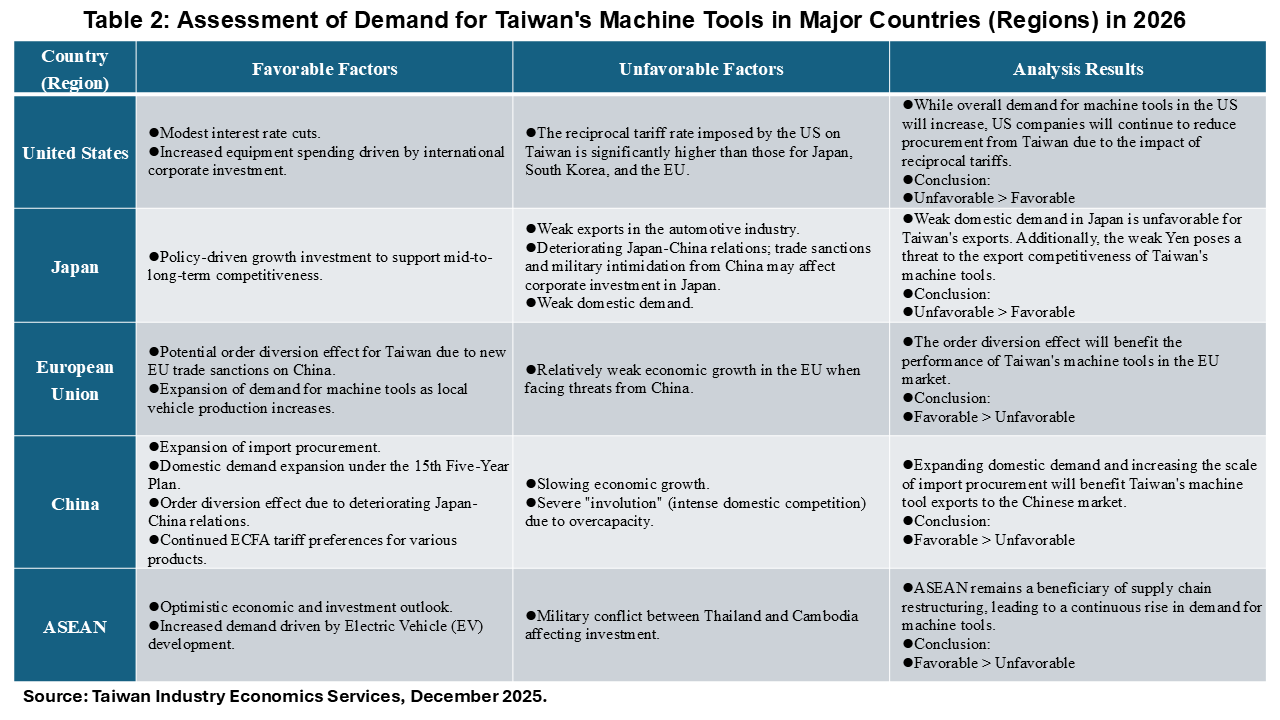 Global monetary conditions are expected to remain accommodative in 2026, and investment enthusiasm in AI and advanced technologies will persist, supporting machine tool demand. However, tariff wars and geopolitical risks will create divergent outcomes across markets: U.S. and Japan orders may decline, while demand from the EU and ASEAN will rise. China’s shift toward expanded imports could also revive Taiwanese exports if firms actively pursue opportunities (see Table 2 for detailed market assessments).