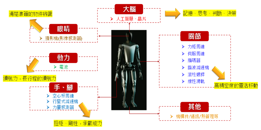 Figure 2 illustrates the performance exhibited by various structures of the humanoid robot. Before discussing the opportunities for Taiwan’s related industries in the current booming global development of humanoid robots, we first identify the primary technical challenges: 1. Autonomous movement, 2. Recognition and identification, 3. Precision control, and 4. Communication.