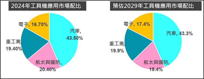 In 2024, the Indian machine tool market mainly supplies the Automotive sector, which accounts for approximately $43.5\%$ of the market, while the Electronics sector has the smallest share at $16.7\%$ (Figure 6). By 2029, the Automotive sector is projected to account for $43.3\%$ of the Indian machine tool market, with an estimated incremental growth of $1.326 billion, remaining the primary application market. While the proportion of the Electronics sector is relatively small (about $17.4\%$), it is expected to have the highest growth rate.