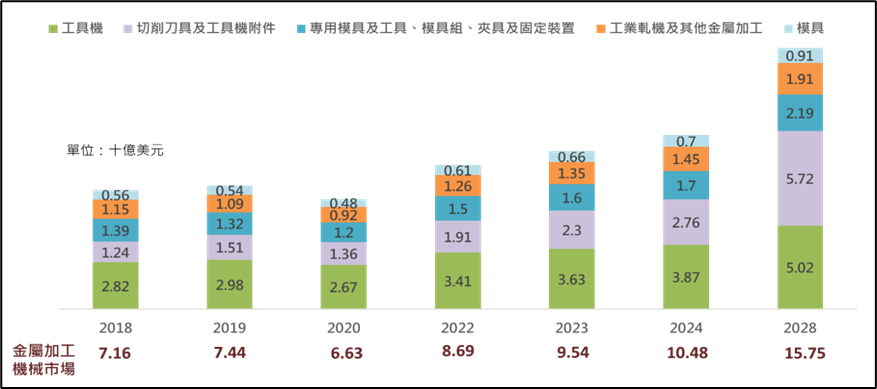 Machine tools are the largest component of the Indian metalworking machinery market, growing from $2.82 billion in 2018 to $3.63 billion in 2023 (CAGR $5.18\%$). It is projected to grow at a CAGR of $6.7\%$, reaching $5.02 billion by 2028.