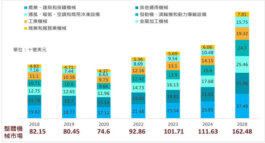 The largest segment is Agriculture, Construction, and Mining Machinery, projected to reach $37.48 billion by 2028.