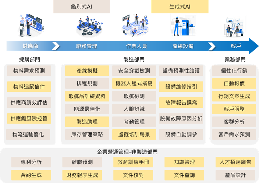 - Production Management: AI optimizes scheduling using workforce, machine status, and material data; Generative AI simulates production lines for optimal layouts.