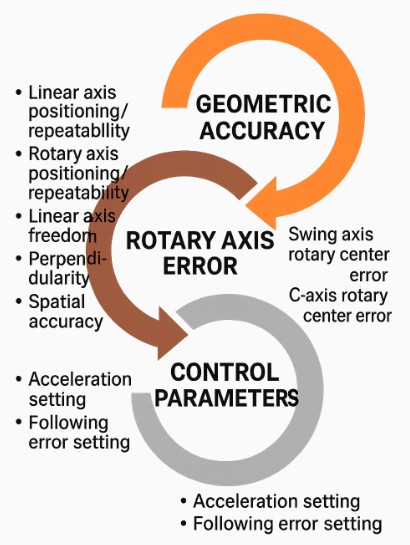 Errors mainly due to geometric accuracy, rotary center misalignment, and control parameters.