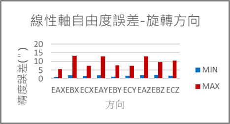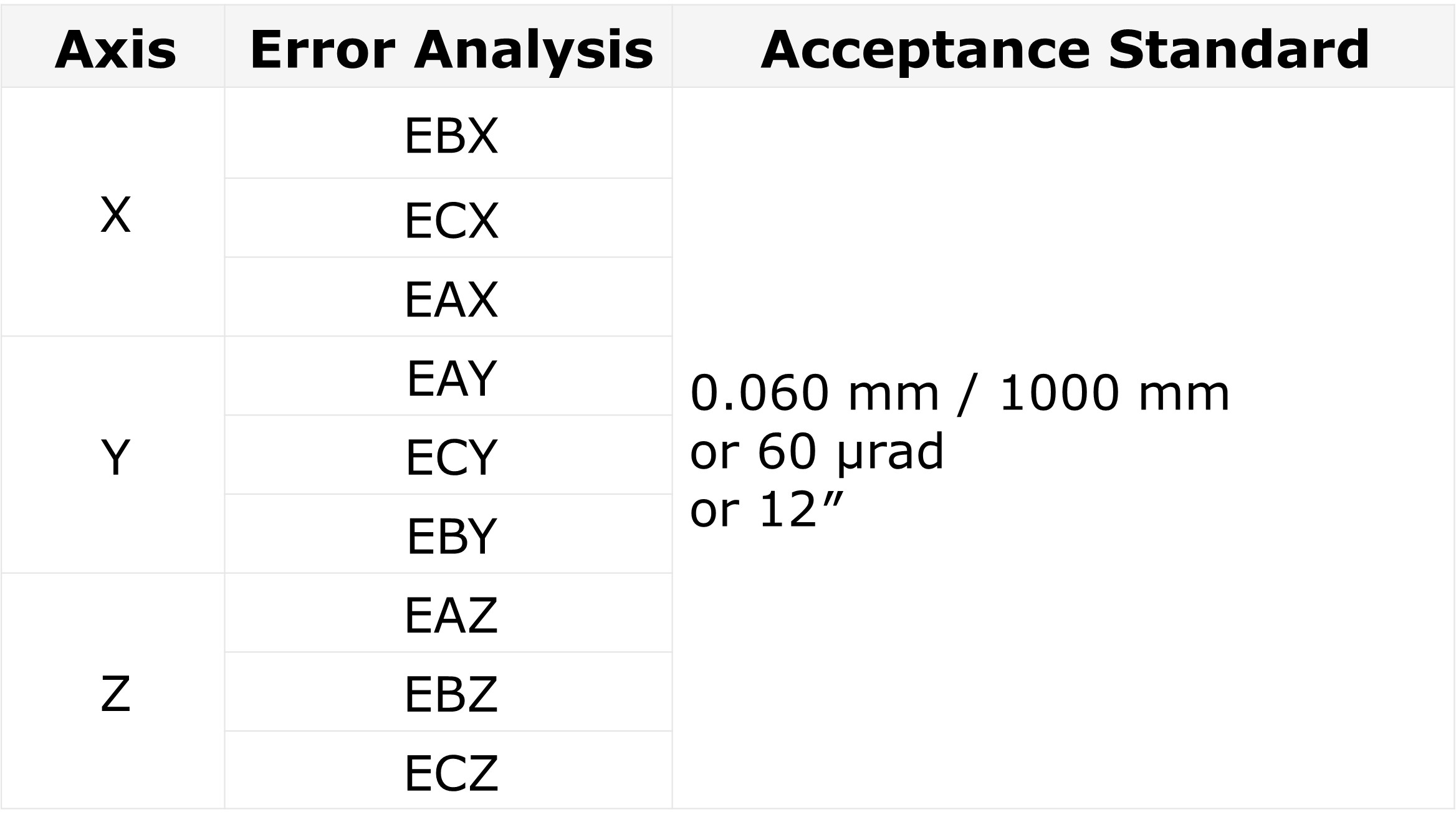- Angular errors: EBX max ~13″; EAX min ~1″; EBY max ~8″; EAZ max ~13″