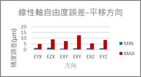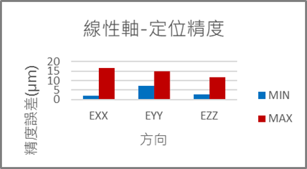 - Positioning accuracy: EXX max ~17µm, min ~2µm; EYY max ~15µm; EZZ max ~12µm