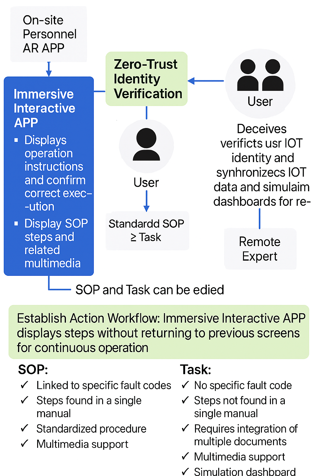 For example, in a robot battery replacement scenario, the immersive environment displays step-by-step instructions and 3D indicators of machine positions, enabling remote experts to verify correctness via synchronized IoT data.