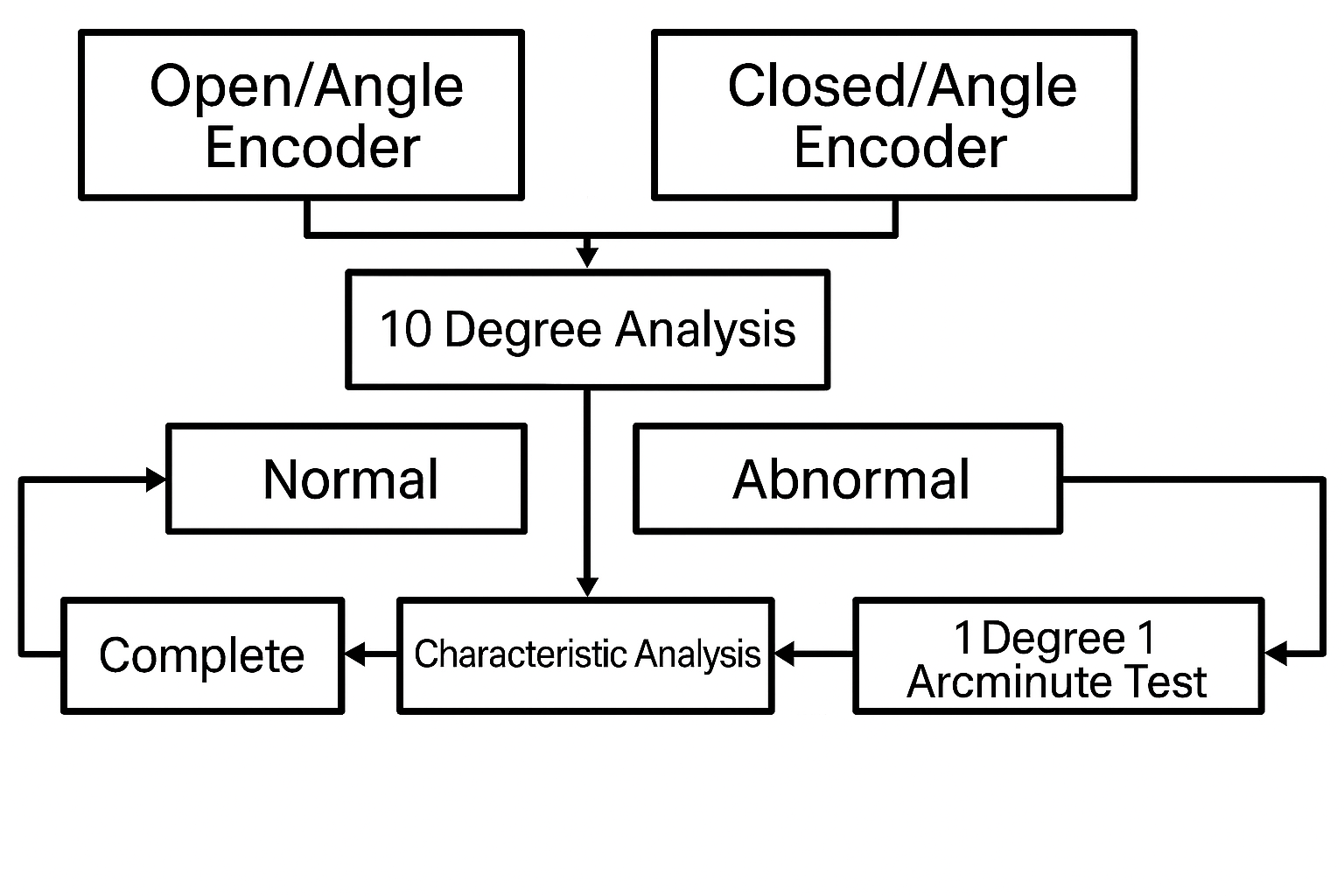 - Encoder OFF: Initial error 155 arc-sec, improved to 19 arc-sec after compensation (87% improvement), but anomalies persist near ±10° range. Detailed 1° checks reveal 45 arc-sec error ignored by 10° increments.