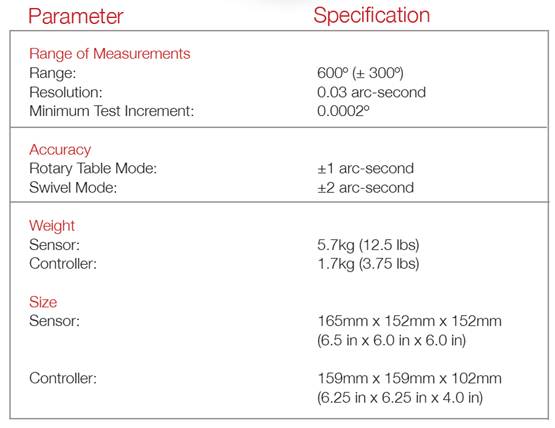 The instrument measures in arc-seconds (1/3600°), with a range of 600°, resolution of 0.03 arc-sec, and minimum increment of 0.0002°. Environmental temperature and humidity must remain within 5% variation. Proper alignment and signal integrity are critical for accurate results.