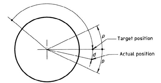 This study measures EAA error, defined as the deviation of a point after rotation around the tilt axis from its target position. The deviation (d) is the distance between actual and target positions, and angular displacement tolerance is p. ISO defines EAA as including angular errors (EBA, ECA) and axial deviations (EXA, EYA, EZA).