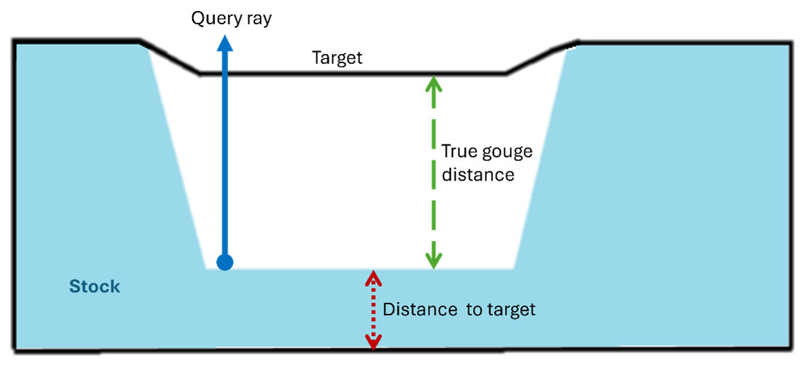 Figure 1 illustrates a geometric comparison case using Ray Tracing. The black outline represents the CAD target geometry, while the blue area represents the stock generated by simulation. A query ray is cast from a point on the stock surface to intersect with the target geometry. If the intersection point exceeds the preset tolerance (0.01 units in this case), a gouge is identified.