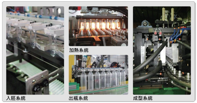 A domestic blow molding equipment manufacturer divides its automated manufacturing process into five system items, as shown in Figure 4: (1) Preform Feeding System transports preforms from the hopper to the unscrambler via a conveyor belt, then automatically arranges them in sequence for single-lane feeding; (2) Rotary System transports the preforms on the single lane to the heating system; (3) Heating System batch-heats the preforms to the target crystallization temperature; (4) Molding System sends the heated preforms to the mold, performs clamping, and executes blow molding; (5) Bottle Output System transports the finished bottles out for connection with downstream process equipment.