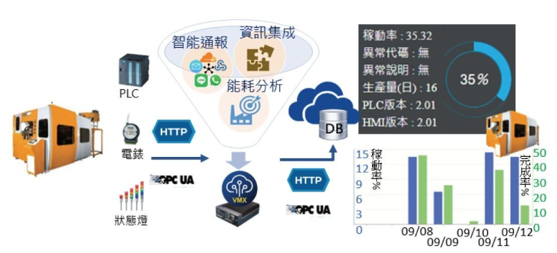 The aforementioned systems typically use common analog I/O, physical analog knobs, and pointer/LED meters, which are not conducive to digital transformation. Therefore, the Edge-Cloud Engine is utilized to introduce ICT (Information and Communication Technology) resources, as shown in Figure 5, facilitating the subsequent development of intelligent value-added modules and production line operation service platforms to address these improvement needs. Examples include digitalized HMI to reduce difficulty in machine adjustment and maintenance costs; an online operation monitoring system to check temperature, pressure, limit switches, electric meters, etc., ensuring correct execution. If issues occur, in addition to the on-site three-color light alarm, an active notification system informs the manufacturer and client simultaneously, ensuring timely resolution of issues to minimize impact on mass production. The establishment of an utilization rate visualization system is expected to provide real-time utilization and OEE, implementing site transparency and enhancing the speed of decision evaluation response. This then extends to multi-equipment and cross-regional integration to strengthen the blow molding equipment manufacturer's automated blow molding line services, creating a Blow Molding Line Operation Service Platform, as shown in Figure 6.