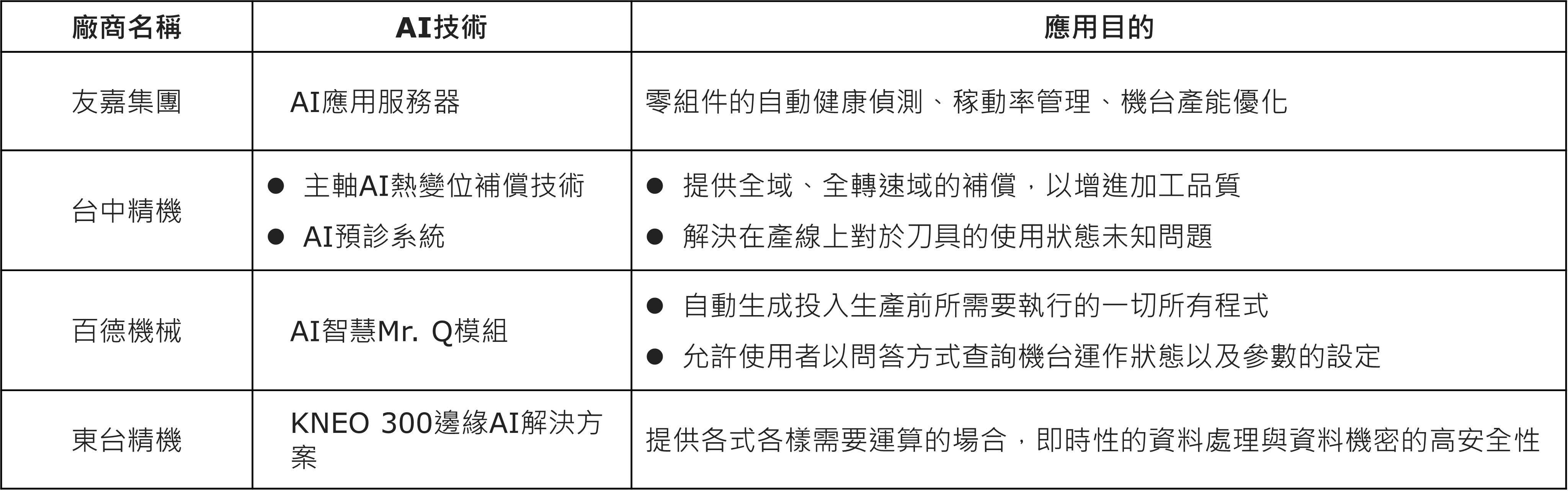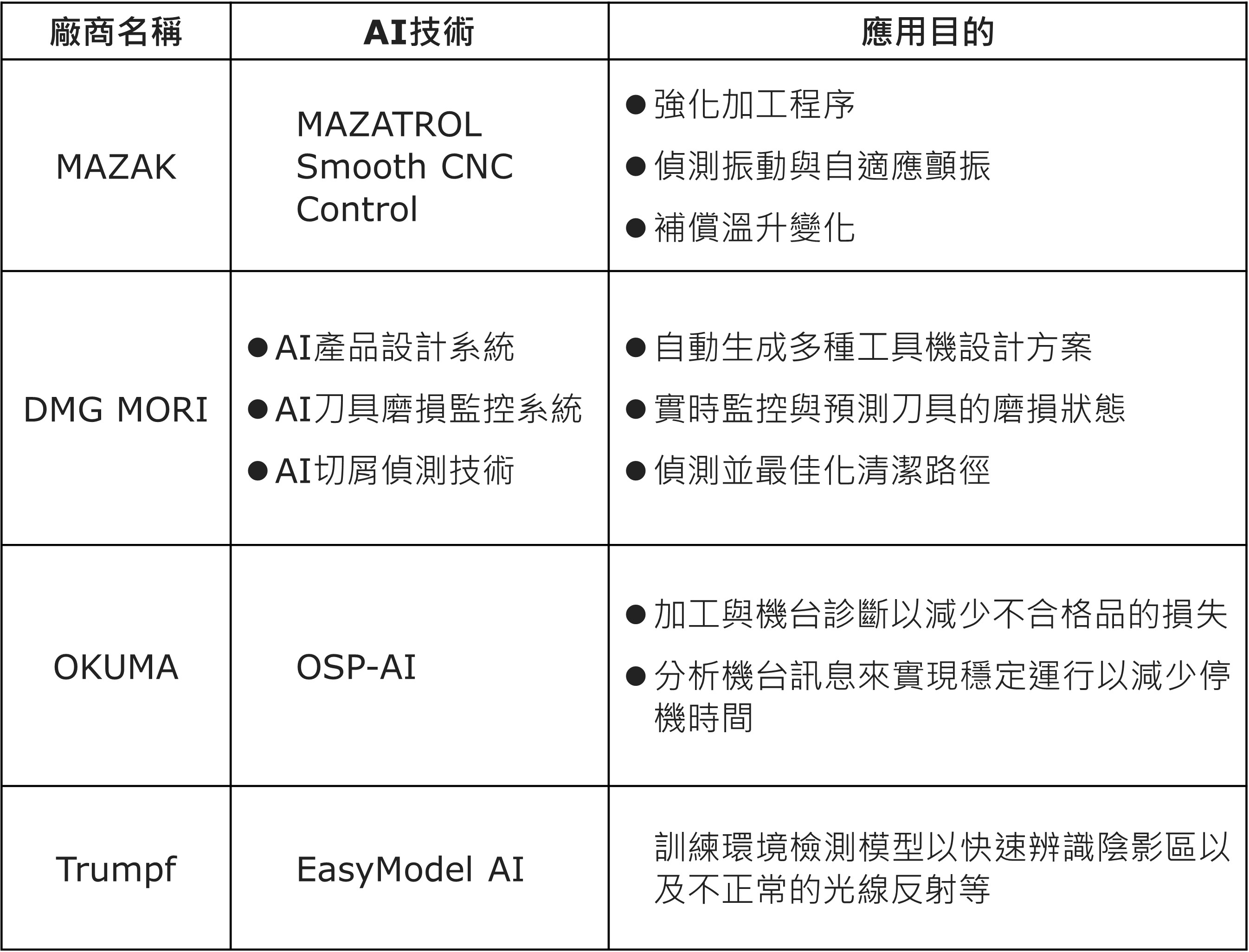 觀察全球工具機產業應用AI技術之發展現況,本文首先針對工具機整機廠商進行盤點與分析,代表案例如下,