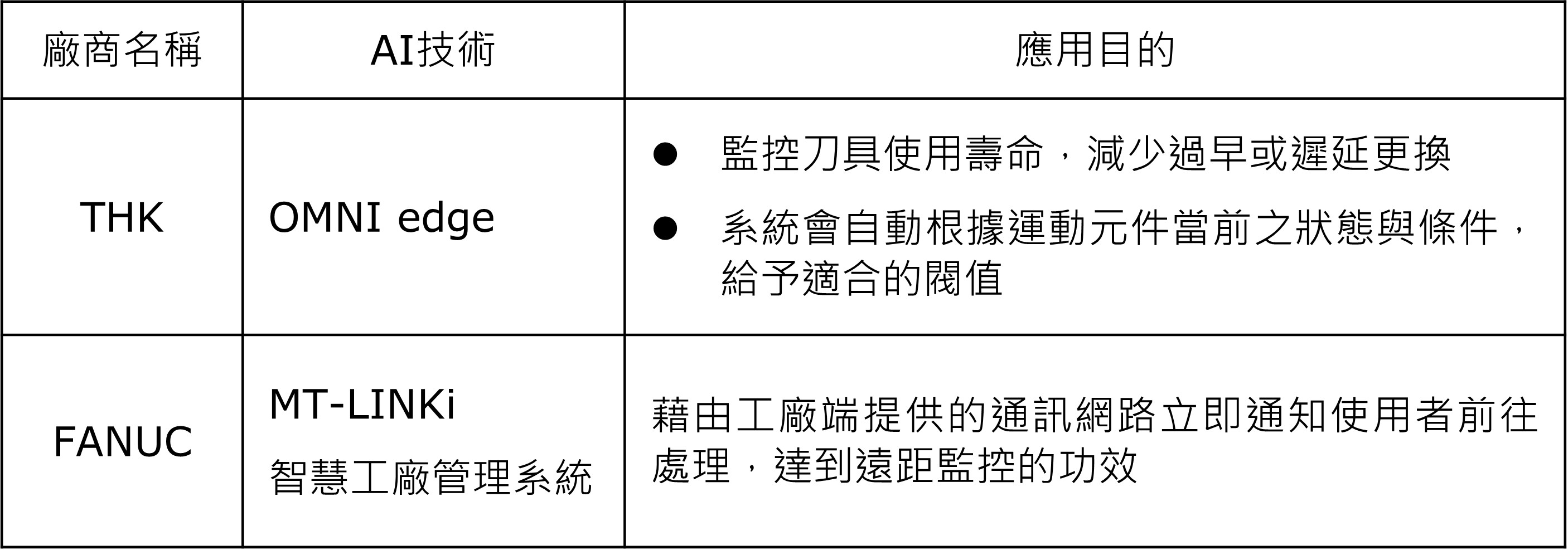國內外零組件廠商應用AI技術現況案例方面,日本THK開發AI工具監測系統解決傳統製造面對在加工時使用的刀具更換問題,可更有效率監控刀具使用壽命,減少過早或遲延更換,減少成本的損失以及更換的頻率;OMNI edge AI偵測計算線性運動元件的狀態,不需要傷透腦筋設定臨界值,系統會自動根據當前條件給予適合的閥值。