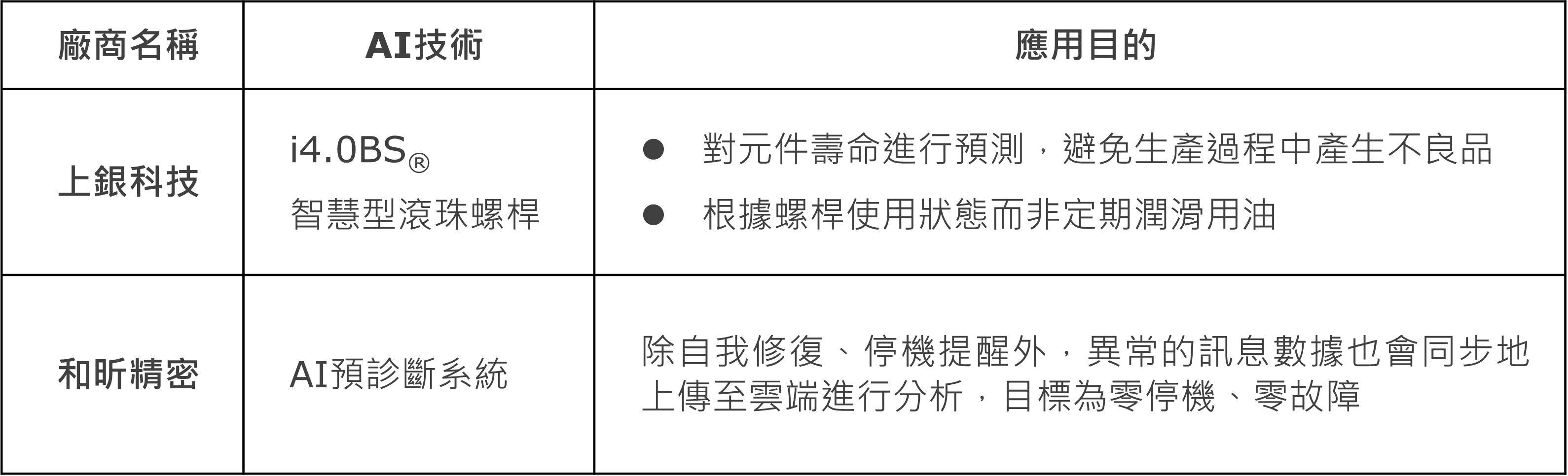 國內方面,上銀科技在傳動元件-滾珠螺桿上增設感測器,對元件壽命進行預測,避免生產過程中產生不良品;另一方面,在維護保養也可以得到很大的改善,根據螺桿使用狀態而非定期潤滑用油,約可減少60-70%的用量。