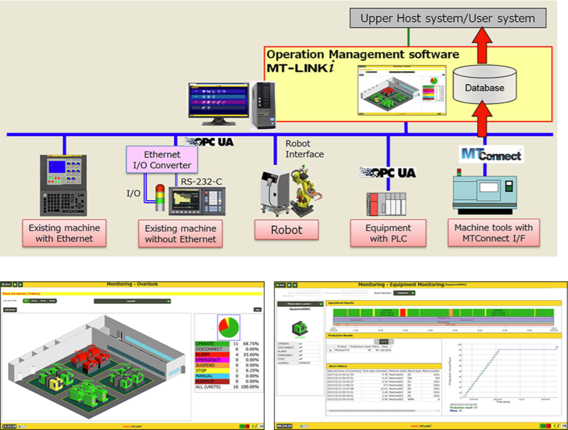 FANUC專為工業4.0設計的數位化平台MT-LINKi,能蒐集CNC工具機稼動時的數據資料檔案進行分析,例如偵測伺服驅動器以及主軸馬達有無異常,若發生異常情形,可藉由工廠端提供的通訊網路立即通知使用者前往處理,達到遠距監控的功效。