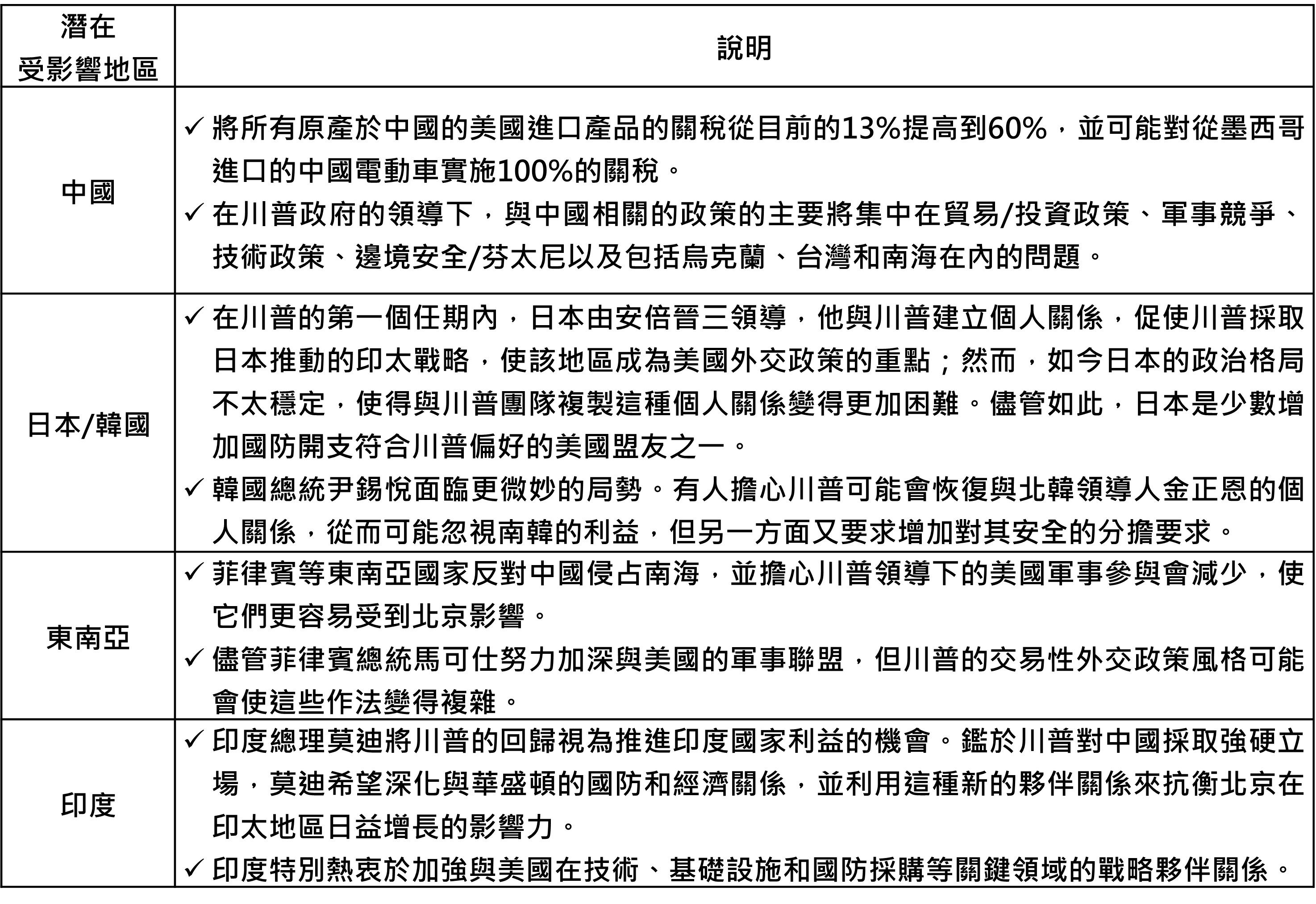川普在2024年美國總統選舉中勝選後,將於隔年一月就職,他的回歸引發各國極大不安,其中包括華盛頓的盟友與亞洲競爭對手;在他的第一個任期(2017-2021)期間,不可預測性是川普外交政策的一個標誌:他尋求促進北韓和南韓之間的對話,但同時加劇了美中緊張局勢,並退出了跨區域協議等關鍵區域協議。然而,自2021年初他卸任以來,世界發生不小的變化:COVID-19帶來的供應鏈挑戰促使各國將經濟韌性提升為國安議題,同時,烏克蘭和中東兩大衝突成為國際事務的焦點,這種不斷變化的格局,加上各國權力動態的變化,將會全球政經局勢帶來更大不確定性。