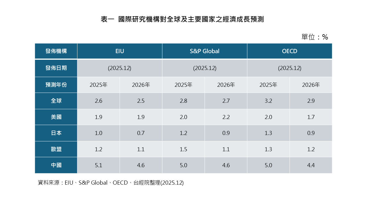 根據多家國際研究機構之經濟預測顯示(見表一),2026年全球和主要經濟體之經濟成長率仍可望維持穩定成長,且美國與中國在馬來西亞進行的第五輪貿易談判結果出現緩和跡象,同時在供應鏈轉移下,東協地區經濟成長仍將呈現成長態勢,此皆有助於全球製造業的投資信心上揚,進而帶動對工具機的需求增加;然而,俄烏戰爭、中東戰火、印度與巴基斯坦、泰國與柬埔寨等地緣政治衝突,以及中國與日本關係惡化、中國與美國是否再度出現彼此貿易制裁等不確定因素,仍會影響2026年全球和主要經濟體的經濟成長表現,以下則針對與我國工具機有著密切關聯(重要市場或主要競爭對手)之主要國家的重大經貿政策推動作進一步分析。
