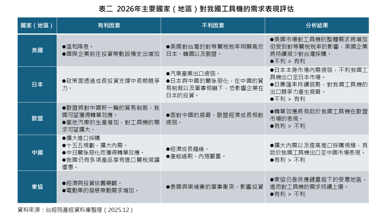 2026年全球主要國家仍可望維持寬鬆貨幣環境,同時AI等科技產業的投資熱潮未減,有助於工具機的需求增加,但關稅戰、地緣政治等因素對我國工具機產業出口至主要市場表現將有所不同,其中來自美國和日本的訂單恐下滑,來自歐盟和東協等地區的需求將增加,而中國將一改以往進口替代政策轉為擴大進口採購,若國內業者積極拓展中國市場,來自中國的訂單也可望回升(見表二)。