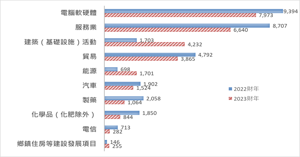 圖 3、2022-2023財年印度 FDI 主要投資產業(百萬美元)