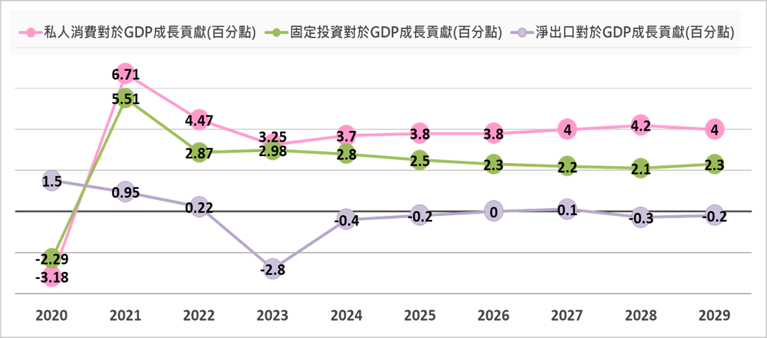 圖 2、2020-2029年GDP支出面成長貢獻度