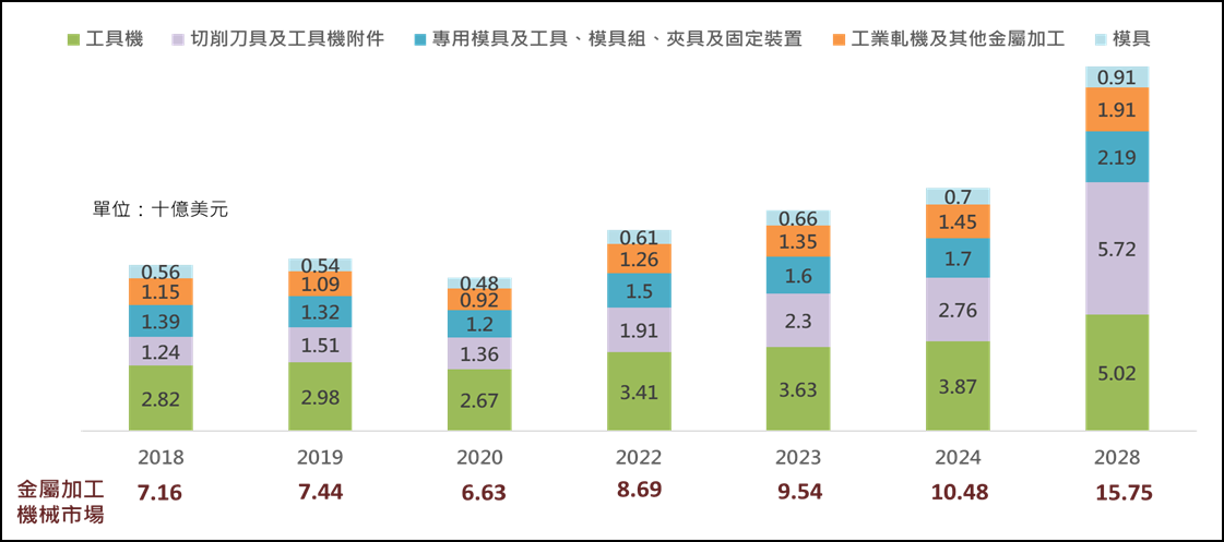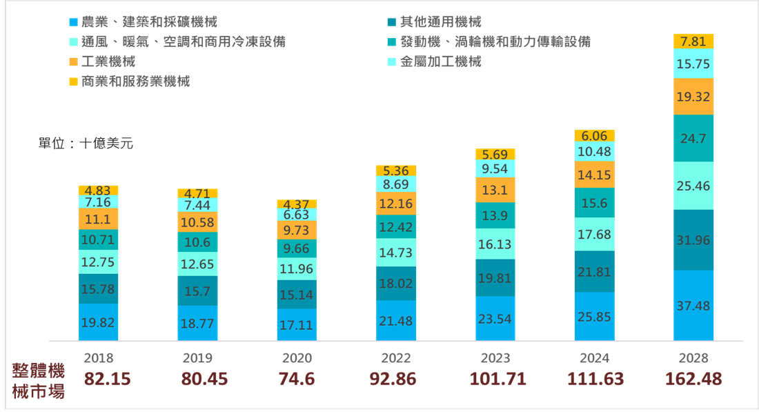 根據TRC、Technavio及Euromonitor等研究機構的預估,印度的機械工具市場正在快速增長。TRC將印度機械市場分為農業、建築和採礦機械;工業機械;商業和服務業機械;通風、暖氣、空調和商用冷凍設備;金屬加工機械;發動機、渦輪機和動力傳輸設備;以及其他通用機械。根據印度政府的統計,印度機械市場從2018年的821.5億美元增長到2023年的1,017.1億美元,複合年增長率約為4.36%。而TRC亦以此為基準,預估未來印度機械市場從2023年到2028年,以9.82%的複合年增長率計算,將達到1,624.8億美元。其中農業、建築和採礦機械市場最大,預估2028年將達374.8 億美元;其他通用機械市場居次,到2028年約可達到319.6億美元,預估複合年增長率約為10.04%;印度通風、暖氣、空調和商用冷凍設備市場預估到2028年達到254.6 億美元。印度引擎、渦輪將於2028年達到247億美元。而印度金屬加工機械市場將從2023年起以10.55%的複合年增長率增長,到2028年達到157.5億美元。印度商業和服務業機械市場從 2023 年起以 6.54% 的複合年增長率成長,到2028年達到78.1億美元。而印度工業機械市場從2018年的111億美元成長到2023年的131億美元,複合年增長率為3.37%,預計該市場將從2023年起以8.08%的複合年增長率成長,到2028年達到193.2億美元。