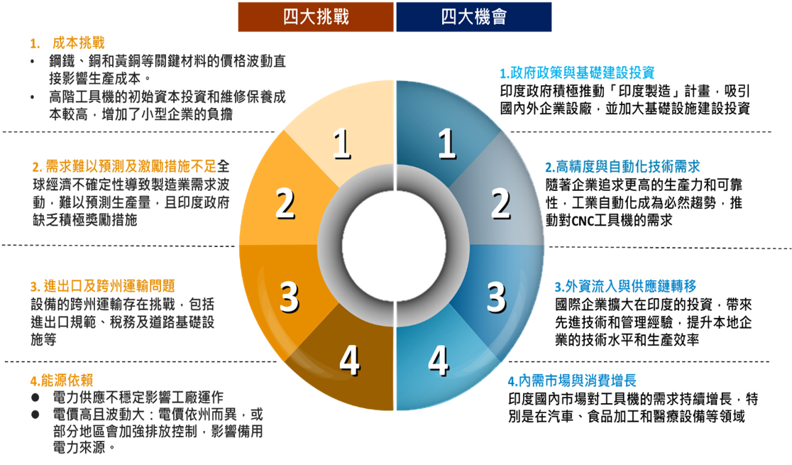 受益於印度政府的「印度製造」計畫、基礎設施投資、工業自動化和智慧製造技術的應用,外資流入和供應鏈轉移帶來高階技術和管理經驗,進一步提升本地企業的技術水平和生產效率。儘管面臨原材料價格波動、成本提升、需求難以預測和能源依賴等挑戰,市場仍展現出強勁的成長潛力和廣闊的發展前景。企業應了解印度市場現況,抓住相關機會,並事先預擬策略應對挑戰。