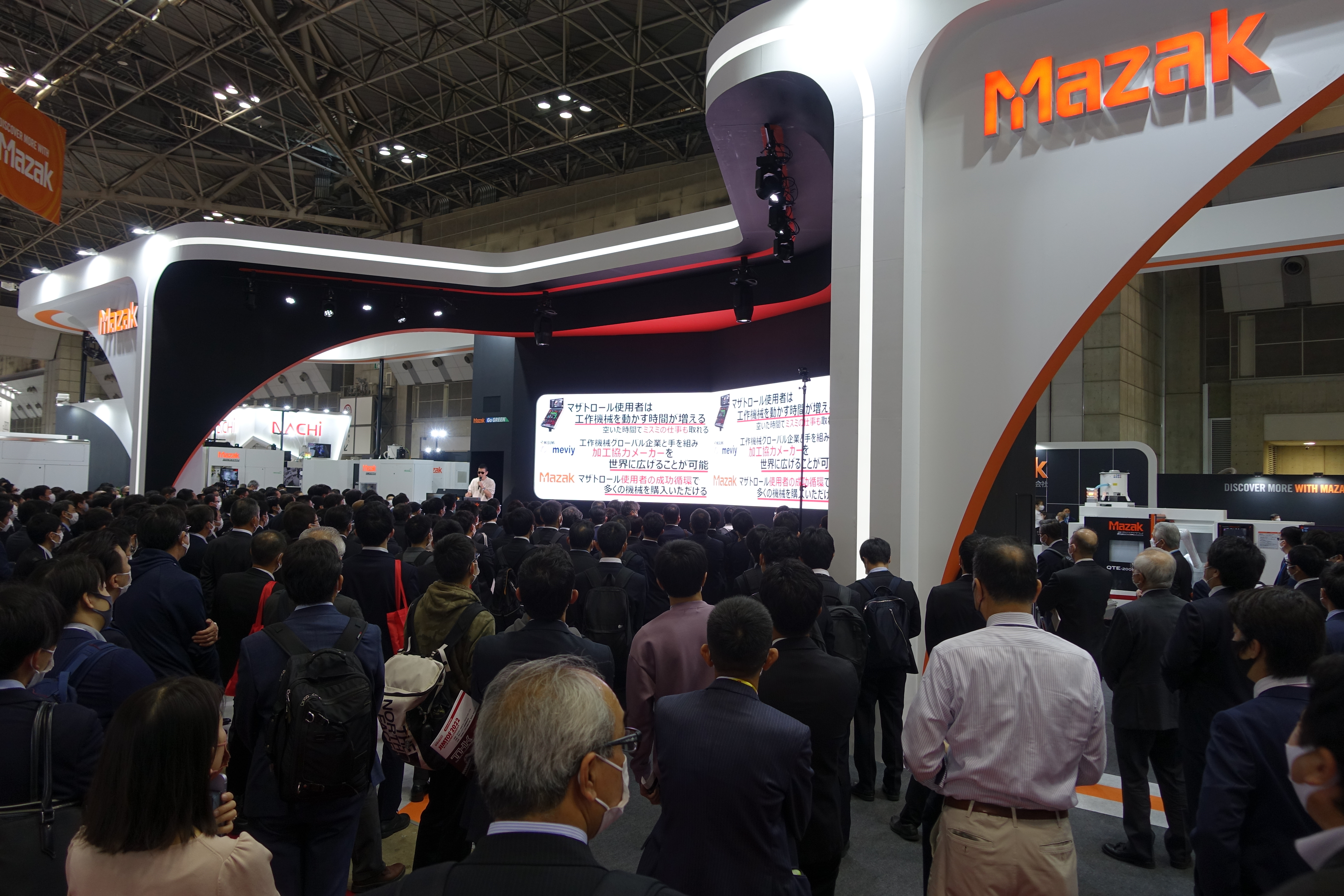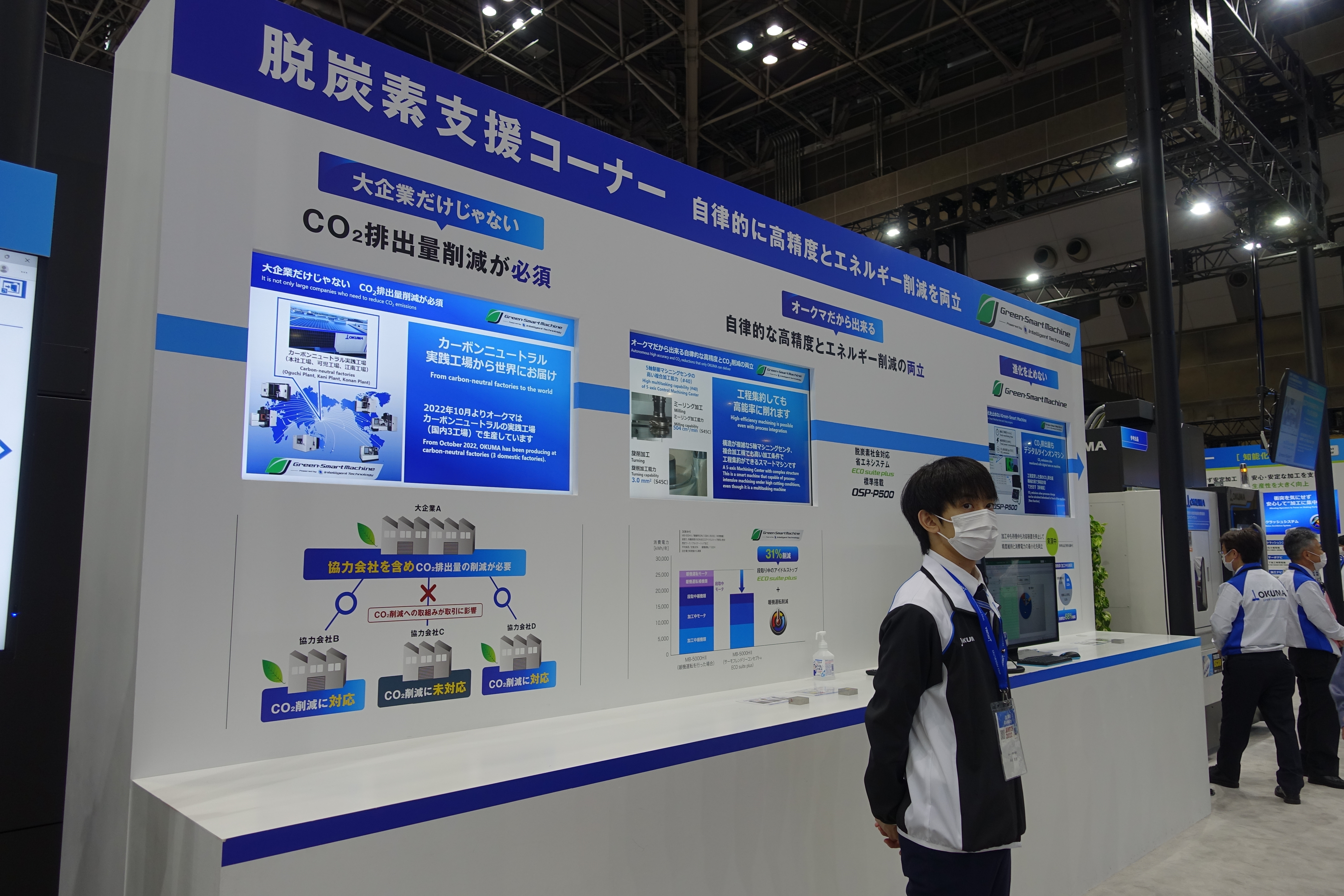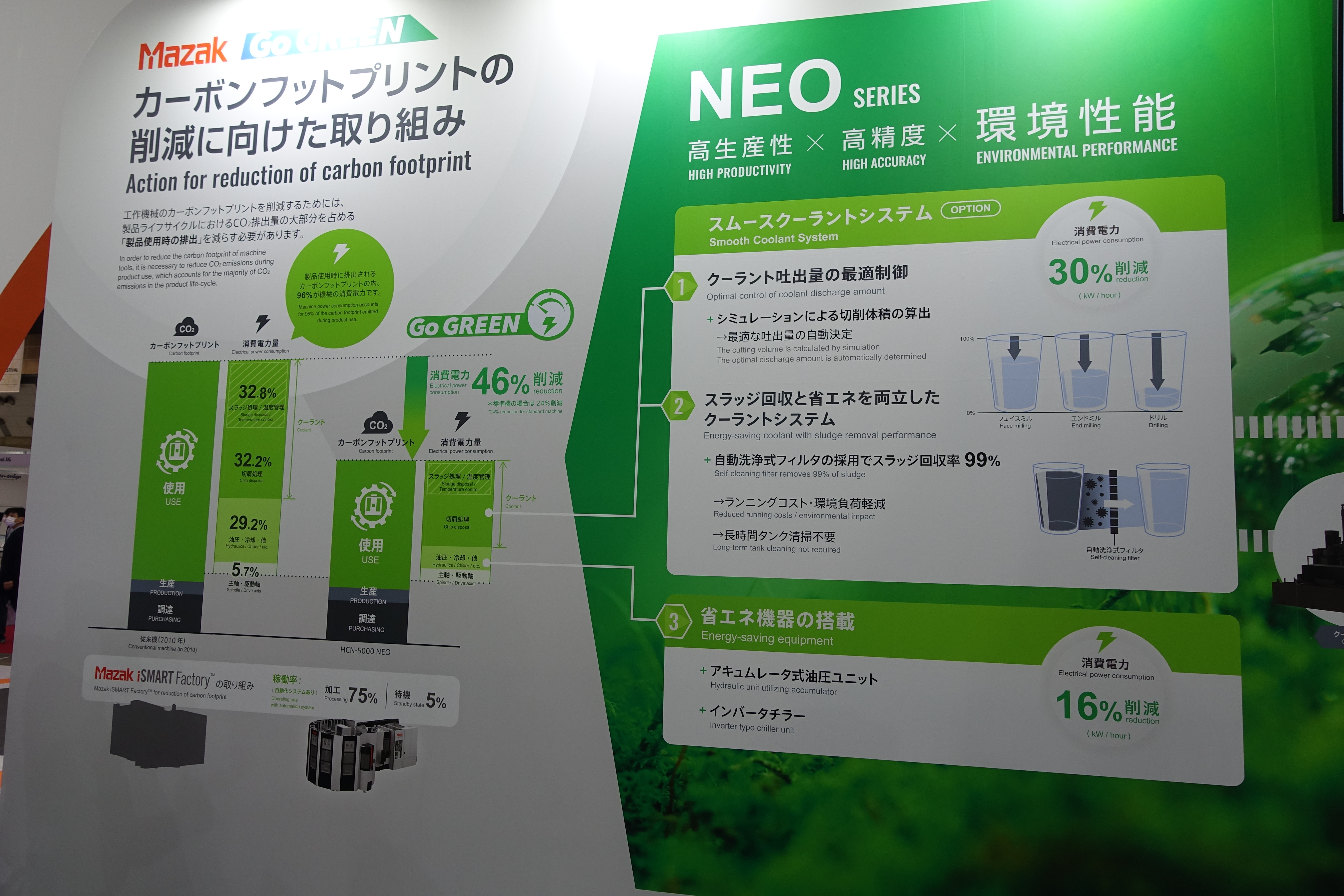 MAZAK位在東五館,攤位主題為「カーボンニュートラルに向けた マザックのデジタル製造ソリューション(MAZAK的數位製造解決方案實現碳中和)」,共展示19台機台,包含五軸加工中心機、雷射加工機等,並提供自動化解決方案MAZAK iConnect。針對減碳議題,MAZAK將「環境」定位為重要的經營課題,致力於在產品生命週期內削減碳排放量,提出「Go Green」口號,目標在2030年碳足跡與2010年相比能減少50%。