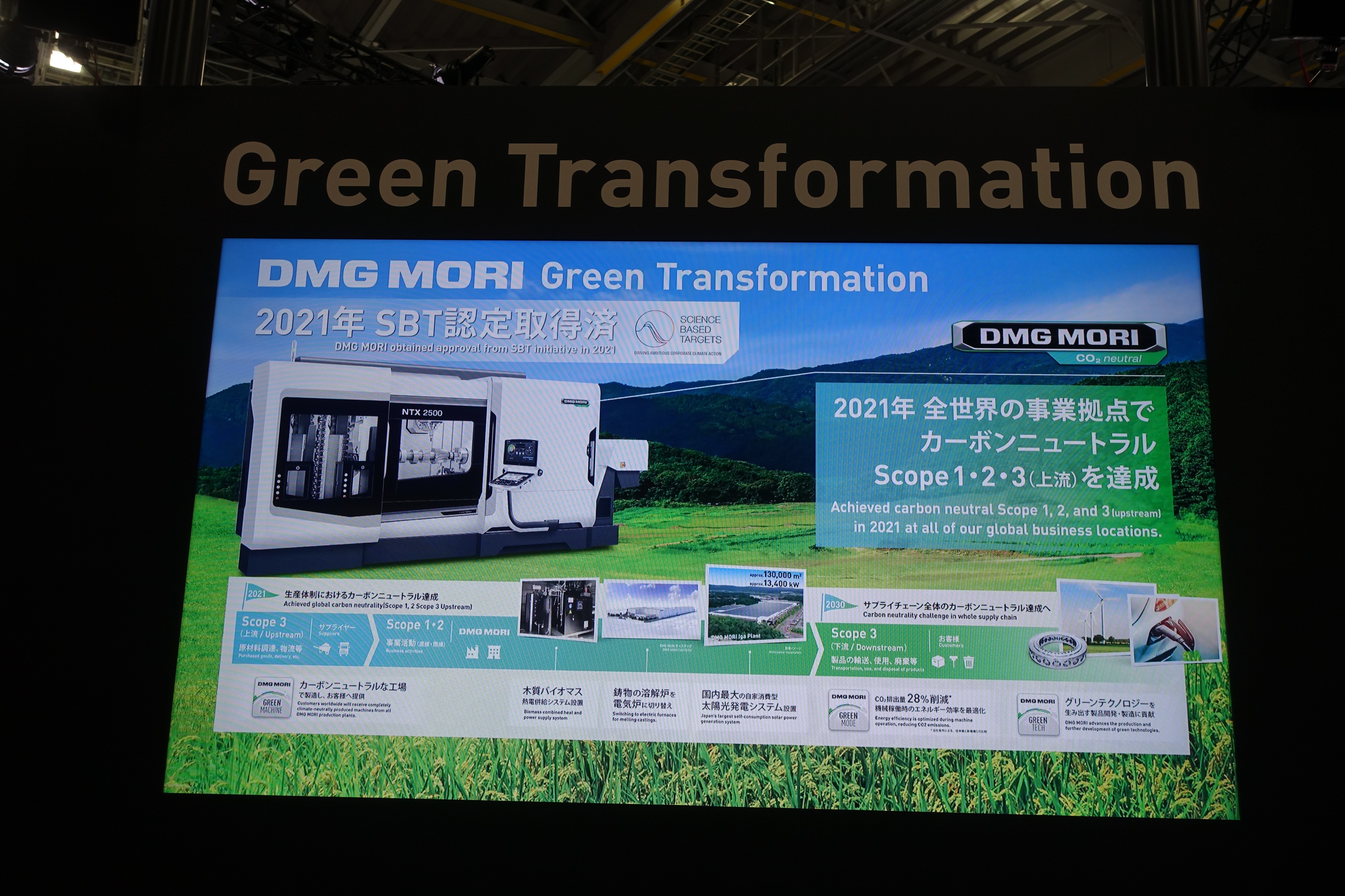 MG MORI延續上屆展出模式,使用近整個東八館,展出九大亮點,分別為:無軌自駕車WH-AMR、物料搬運系統MATRIS Light、刀具儲存庫CTS、技術週期、智能切屑去除、油霧回收機zeroFOG、水箱除淤、數位轉型DX、綠色轉型GX。其中,針對綠色轉型,DMG MORI已於2021年取得SBT(Science Based Targets)認證,在其全球的工廠實現碳中和。