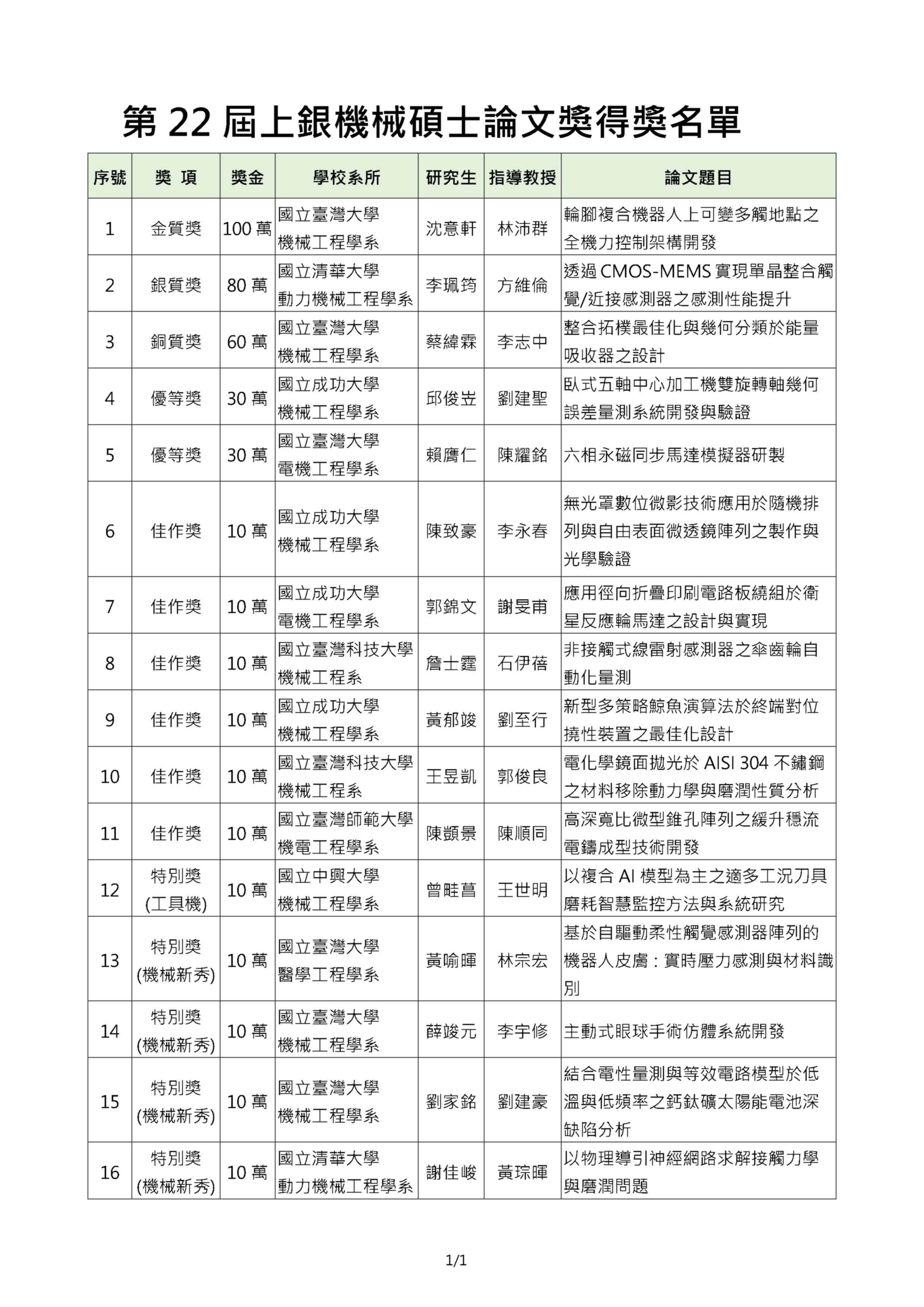 第22屆「上銀機械碩士論文獎」(Hiwin Thesis Award)頒獎典禮於3月28日隆重舉行。臺灣大學沈意軒同學與林沛群教授以「輪腳複合機器人上可變多觸地點之全機力控制架構開發」榮獲最高榮譽「金質獎」頒發獎金新台幣100萬元。臺灣大學今年共推薦14篇論文參賽,其中9篇進入決審,最終6篇獲獎展現頂尖實力,為本屆最大贏家。