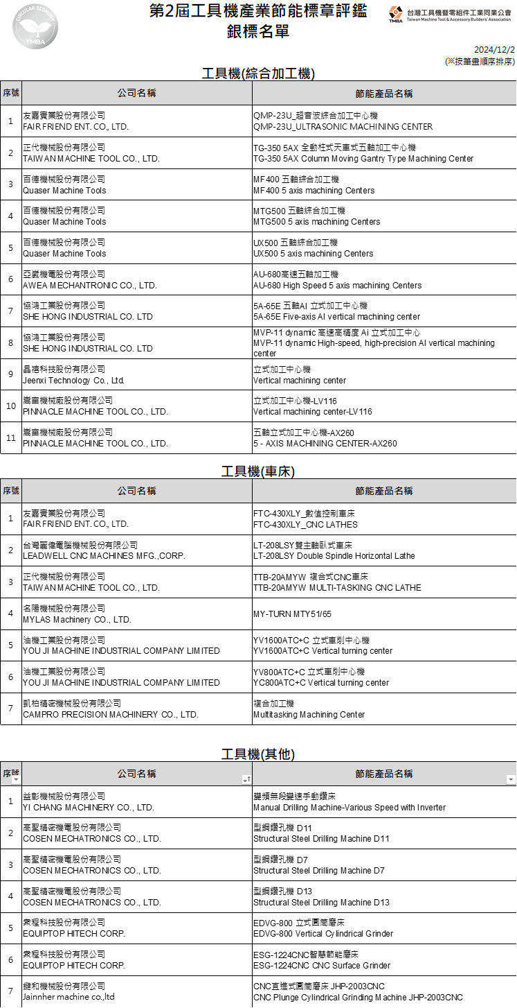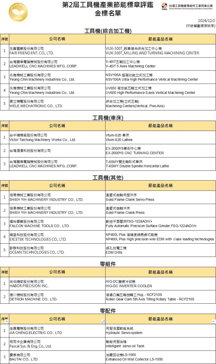 台灣工具機暨零組件工業同業公會(以下簡稱TMBA)自TMTS 2024台灣國際工具機展辦理首屆「工具機產業節能標章」評鑑後,引起業界廣大迴響,工具機廠及零組件廠紛紛持續投入綠色技術研發改善,故TMBA特持續辦理第2屆「工具機產業節能標章」評鑑,篩選出具節能之工具機或零組件以協助終端客戶參考選用。