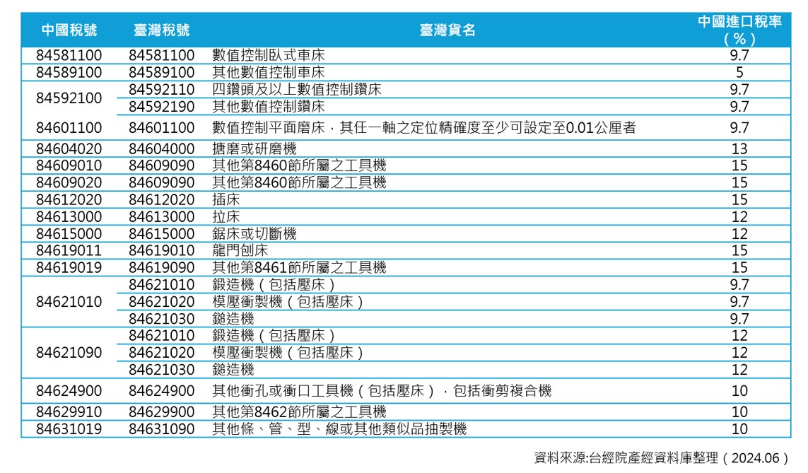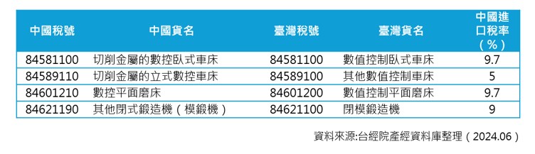 然而,2024年5月20日之後兩岸再度陷入緊張關係,中國大陸宣布中止《海峽兩岸經濟合作框架協議》關稅減讓產品(第二批)清單,以中國大陸的稅則分類共有134項產品被中止,其中有關工具機產品則有4項(詳見表二),除了「84589110 切削金屬的立式數控車床」之進口稅率為5%之外,另三項產品進口稅率為9.0%和9.7%,在稅率減讓優惠中止後這些產品日後在中國大陸市場的競爭表現將受到較大壓力。