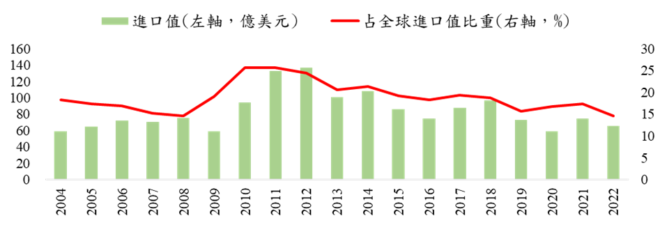 2、2011年以來中國大陸採取進口替代政策造成其工具機業的進口值下滑,但仍是全球工具機最大進口國家