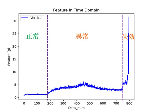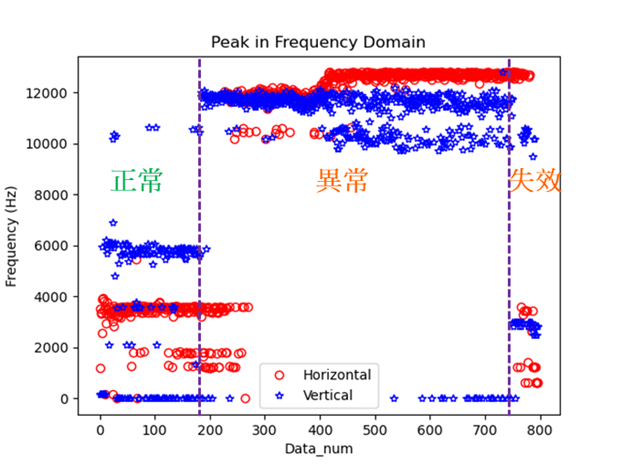 接著,從頻域的分佈圖中於第7310秒後,於1000~4000Hz的相對低頻中開始有特徵出現,而對照時域圖中,也是於第7310秒時特徵值從5g開始有著更明顯的上升幅度。因此我們認為此時的軸承正在進行失效,並將第7310秒做為異常與失效的劃分界線。利用上述方法,本研究將正常與異常數據進行劃分及分類,讓軸承壽命週期的狀態更為明確,進而用於馬達異常監控。