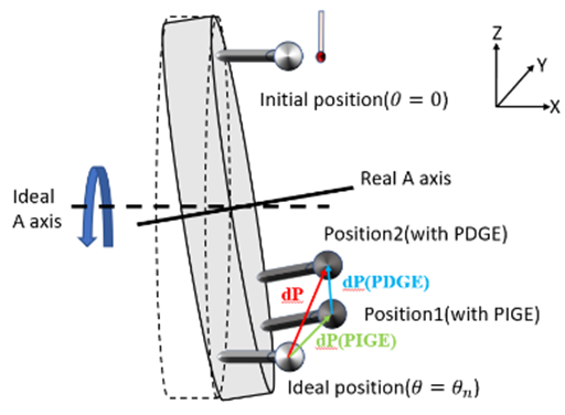 運動誤差來自於工具機零件製造時的瑕疵,導致零件之間的相對運動產生偏移與偏擺,使方塊產生另一體積誤差dP (PDGE),並移動到Position2,Position2與ideal position即實際位置與理想位置之間的偏差,也就是總體積誤差dP。透過建立體積誤差與旋轉軸幾何誤差的關係,可以解析雙旋轉軸的安裝與運動誤差。系統透過擬合方塊尖點位置,量測方塊平面的法向量和一點位置,求出平面方程式,再聯立三個平面方程式計算尖點的機械座標值,避免測量誤差。接著考慮平面法向量的偏擺與旋轉軸幾何誤差之間的關係。