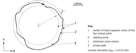 BK2為旋轉軸(C軸) 與XY軸同動之刀尖跟隨路徑(XYC) 建議速度為360˚/min,量測角度建議360 ˚並且需量測順時針與逆時針方向,或由製造商與購買者協議。