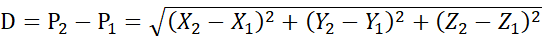 量測空間精度,建議以增量式量測,架設起點座標為P1(X1,Y1,Z1),終點座標為P2(X2,Y2,Z2),量測長度(D)可透過公式1計算。