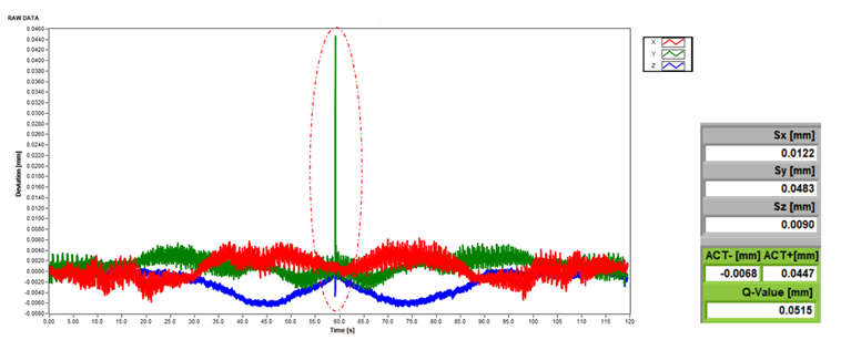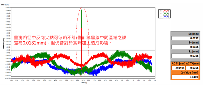 刀尖跟隨誤差為綜合性誤差結果,可將精度誤差原因歸類為幾何精度、旋轉中心與電控參數三大類,如圖二十六所示,當同動精度誤差不符合廠內標準時,可先進行旋轉中心補償與參數調整進行優化,再透過如自由度測試、空間精度測試、定位精度測試等,解析誤差原因進行相關調整,優化刀尖同動精度,提升加工品質,於廠商個別案例中如圖二十七所示,為BK1靜態同動精度量測,同動軸向為XZB軸,由測試結果顯示,最大總和誤差為:126.3µm,分析為旋轉中心誤差過大所導致,經進行旋轉中心位置補償後,再進行量測,測試結果如圖二十八所示,最大總和誤差為:11.05µm,BK1動態誤差如圖二十九所示,最大總和誤差為:12.5µm(無計算反向尖點,但同動加工時仍會有一痕跡),此外從圖二十八測試結果顯示,當執行BK1測試時,路徑為B軸在XZ平面上進行,不應有Y方向之誤差量,但Y軸仍有約7.6µm誤差,並會隨著B軸旋轉角度呈線性分布,研判主要原因可能為B軸軸線與Y軸不平行所造成;執行BK2靜態測試時,同動軸向為XYC軸,由測試結果顯示,最大總和誤差為:32.4µm,誤差值過大,測試結果如圖三十所示,經旋轉中心補償後,測試結果如圖三十一所示,最大總和誤差為:10.4µm,精度誤差有明顯改善,但由測試結果顯示Z軸向能會因C軸位置變化呈現線性分布,主要原因可能為Y軸自重下垂,導致C軸與Z軸平行度的誤差,BK2動態誤差如圖三十二所示,最大總和誤差為:13.2µm(無計算反向尖點,但同動加工時仍會有一痕跡),BK4五軸同動動態誤差如圖三十三所示,最大總和誤差為:18.2µm(無計算反向尖點,但同動加工時仍會有一痕跡)