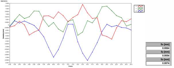 對角線空間精度量測,標準規範並無規定允收數值,本次測試結果如圖二十所示,整體誤差差約在30µm以內,D1最大誤差約為25µm,最小誤差約為6µm;D2最大誤差約為30µm,最小誤差約為7µm;D3最大誤差約為27µm,最小誤差約為6µm;D4最大誤差約為28µm,最小誤差約為5µm。
