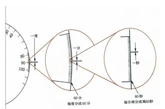 五軸機精度檢驗,本文中其角度誤差均以〝角秒〞表示,如圖三所示,1 度60 角分(arc-min);1 角分60 角秒(arc-sec);1 度為3600 角秒,即一角秒約0.000278度,如以氣泡式水平儀表示,如圖四所示,泡式水平儀一格為0.02mm/m ≒ 4角秒,或是0.005mm/m(1/4格) ≒ 1角秒。