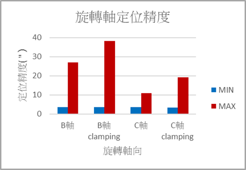旋轉方向誤差,大多符合ISO 10791-2,其中X軸向最大誤差為EBX約13〞,最小誤差為EAX約1〞;其中Y軸向最大誤差為EBY約8〞,最小誤差為EBY約1〞;其中Z軸向最大誤差為EAZ約13〞,最小誤差為ECZ約2〞。