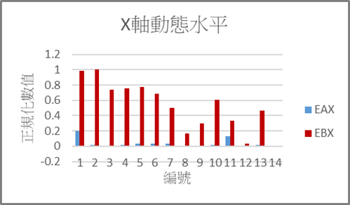 由於動柱式五軸機構型,X軸向須背負滑座、鞍座、頭座等Y、Z軸結件重量,如圖一所示,因此X軸向時運行時,因受質量與慣性力等緣故,使得EBX角度誤差大,如圖十所示,將X軸旋轉自由度誤差值正規化,大多機台EBX誤差會大於EAX與ECX,此外在量測單軸自由度時,同時於不動件(工作台)架設電子水,量測工作台動態水平,相關測試結果進行正規化後, 如圖十一所示,由測試結果顯示,當移動X軸向時,工作台雖然為固定不動,但還是會受到移動件慣量的影響,能會導致EBX誤差較大。