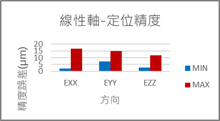 單軸自由度測試結果如圖七~圖九所示,定位精度誤差,EXX最大誤差約:17µm,最小誤差約:2µm;EYY最大誤差約:15µm,最小誤差約:2µm;EZZ最大誤差約:12µm,最小誤差:2µm,皆符合ISO 19791-4標準規範,雙向定位精度28µm之允收值;平移方向最大誤差為EZY約為13µm,最小誤為EXY約為1µm。