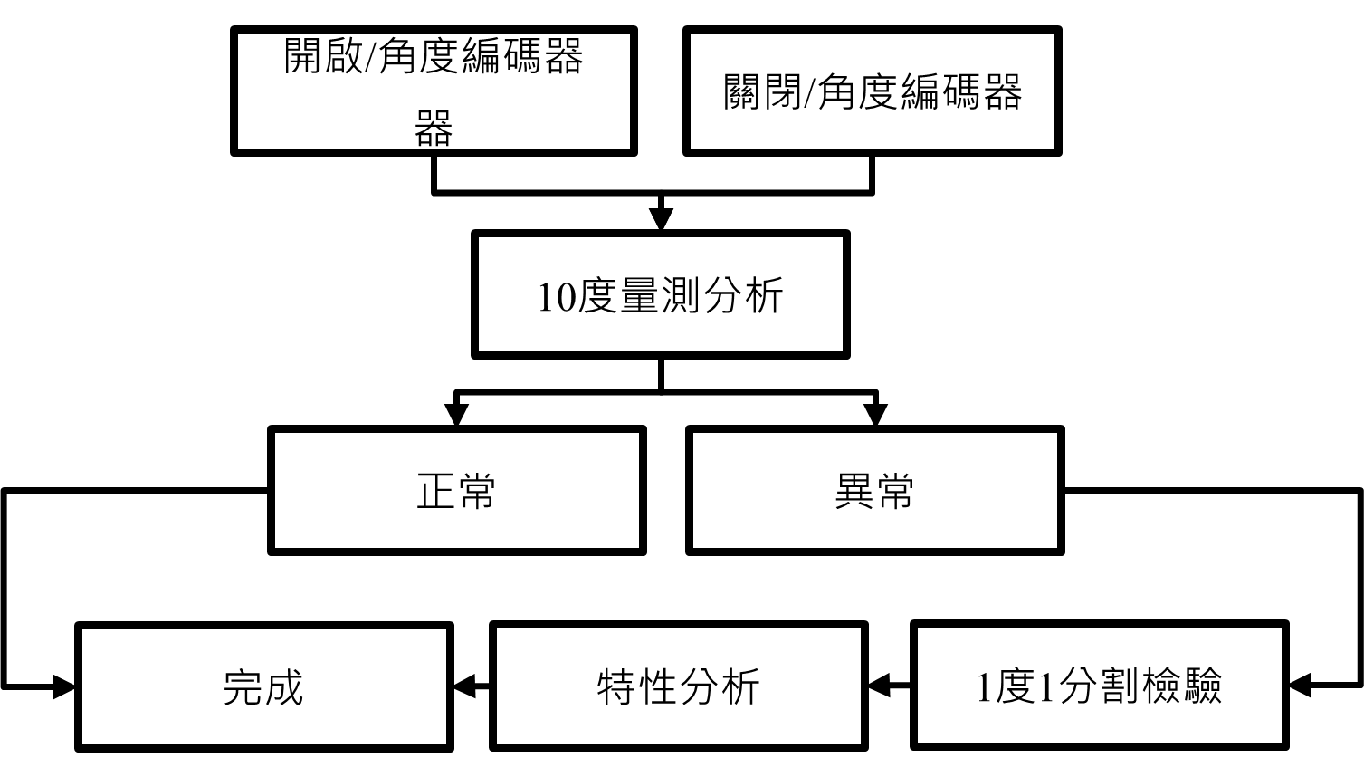 本文將比較分析開啟/關閉角度編碼器其檢驗圖形,進而探討傾斜軸性能。檢驗流程圖如圖六所示,進行開啟/關閉角度編碼器的傾斜軸定位精度量測,以10度為間距;在來進行圖形判別與分析,經補正後圖形正常即完成,若圖形異常則在異常範圍內進行1度1分割的量測檢驗,探討其機構特性。