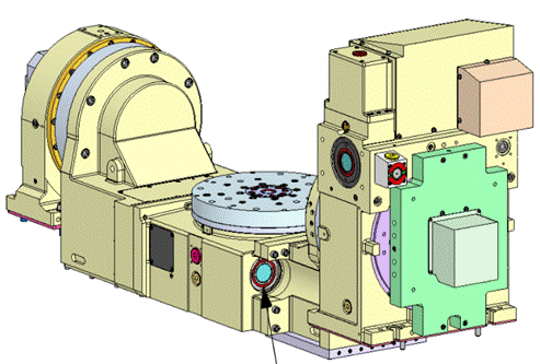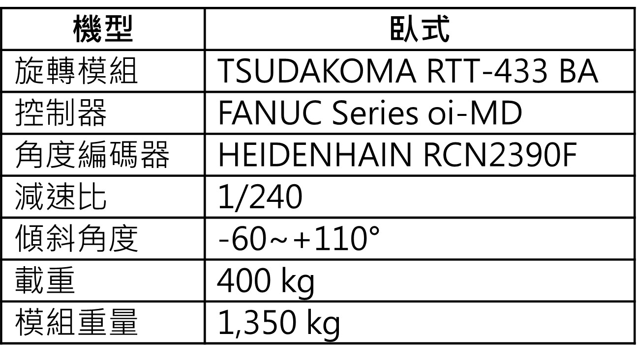 此搖籃機構傾斜角度為-60~+110°,減速比1/240,最大可承受載重400kg,模組重量1350kg,搭載HEIDENHAIN RCN2390F角度編碼器,採用控制系統為FANUC Series oi-MD。