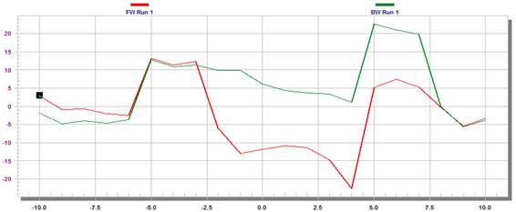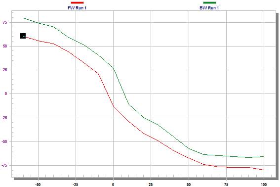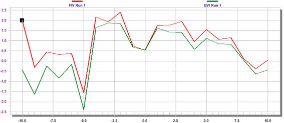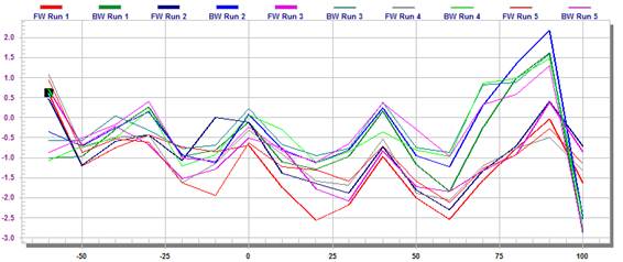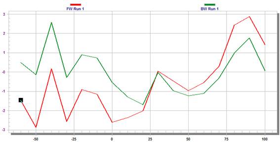 首先開啟角度編碼器進行去回一趟量測,圖形判斷為正常情況後,進行補償後量測去回五趟,確認改善定位精度,最後比較補償前後圖形變化。由以下檢驗圖形可以得知,其補償前即達到5.7arc-sec的微小誤差,補償後更縮至4.7arc-sec;最後比較補償前後圖形,因誤差皆小於6arc-sec內,經由軟體計算其圖形路徑重疊率達85%,統整以上測試結果可以確認,於開啟角度編碼器情況下此模組性能非常高。